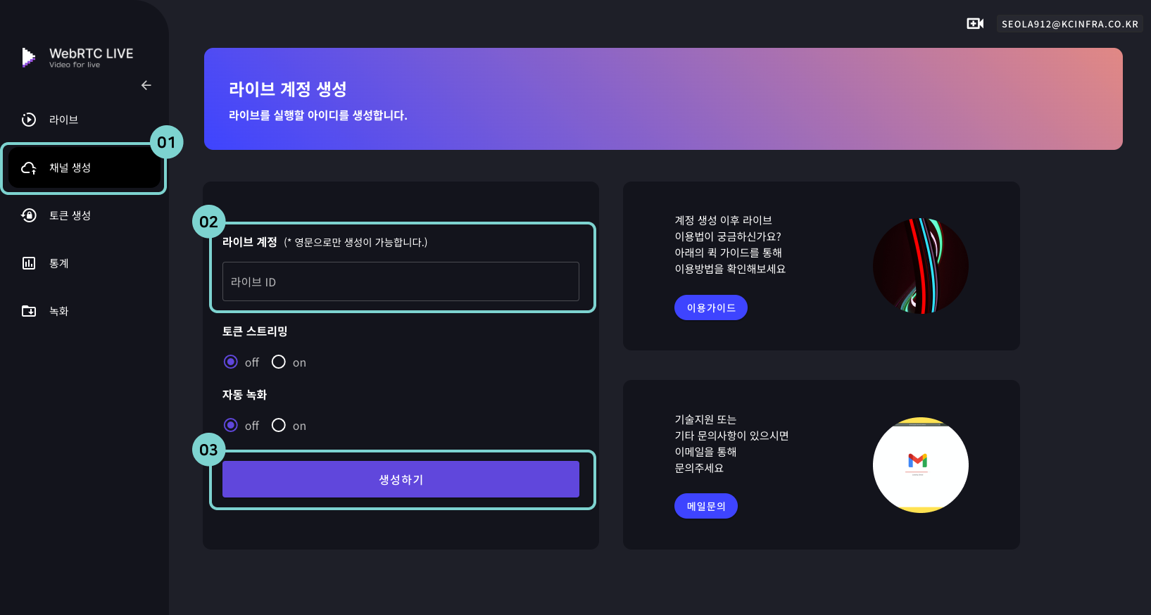 라이브를 진행할 채널을 생성합니다. 채널 생성에 갯수제한은 없지만, 중복된 채널명은 생성 불가합니다.