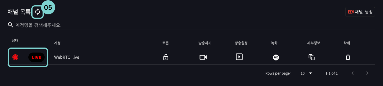 5. 채널목록으로 돌아와, 새로고침 버튼을 클릭하면, 라이브 상태가 활성화된 표시를 확인할 수 있습니다.