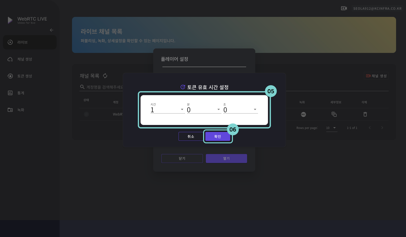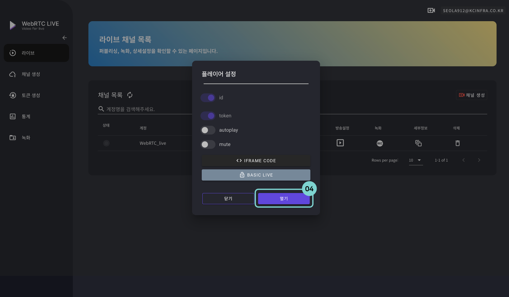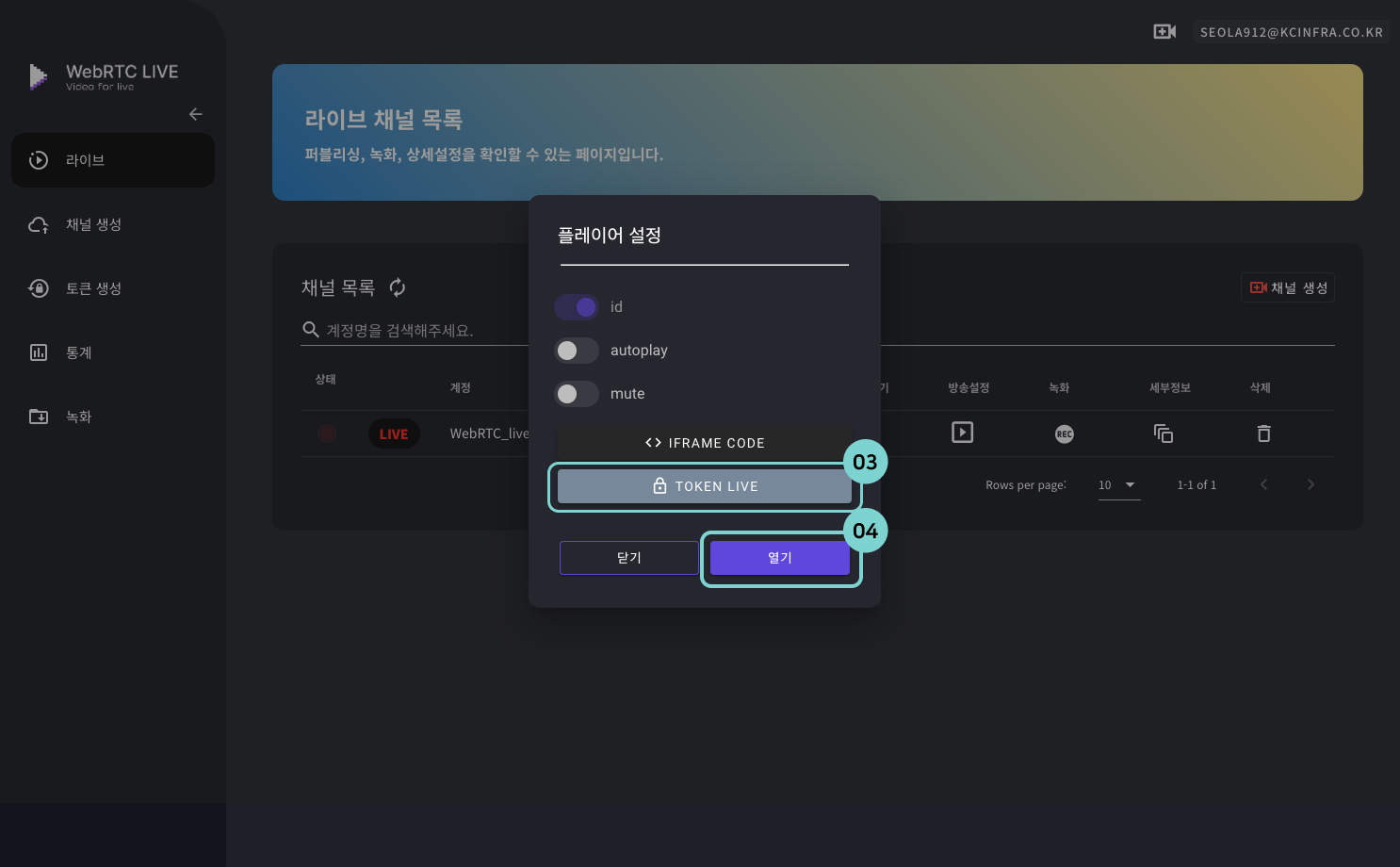 3. 플레이어 설정에서, TOKEN LIVE 버튼을 클릭하여, 토큰 활성화를 해줍니다.