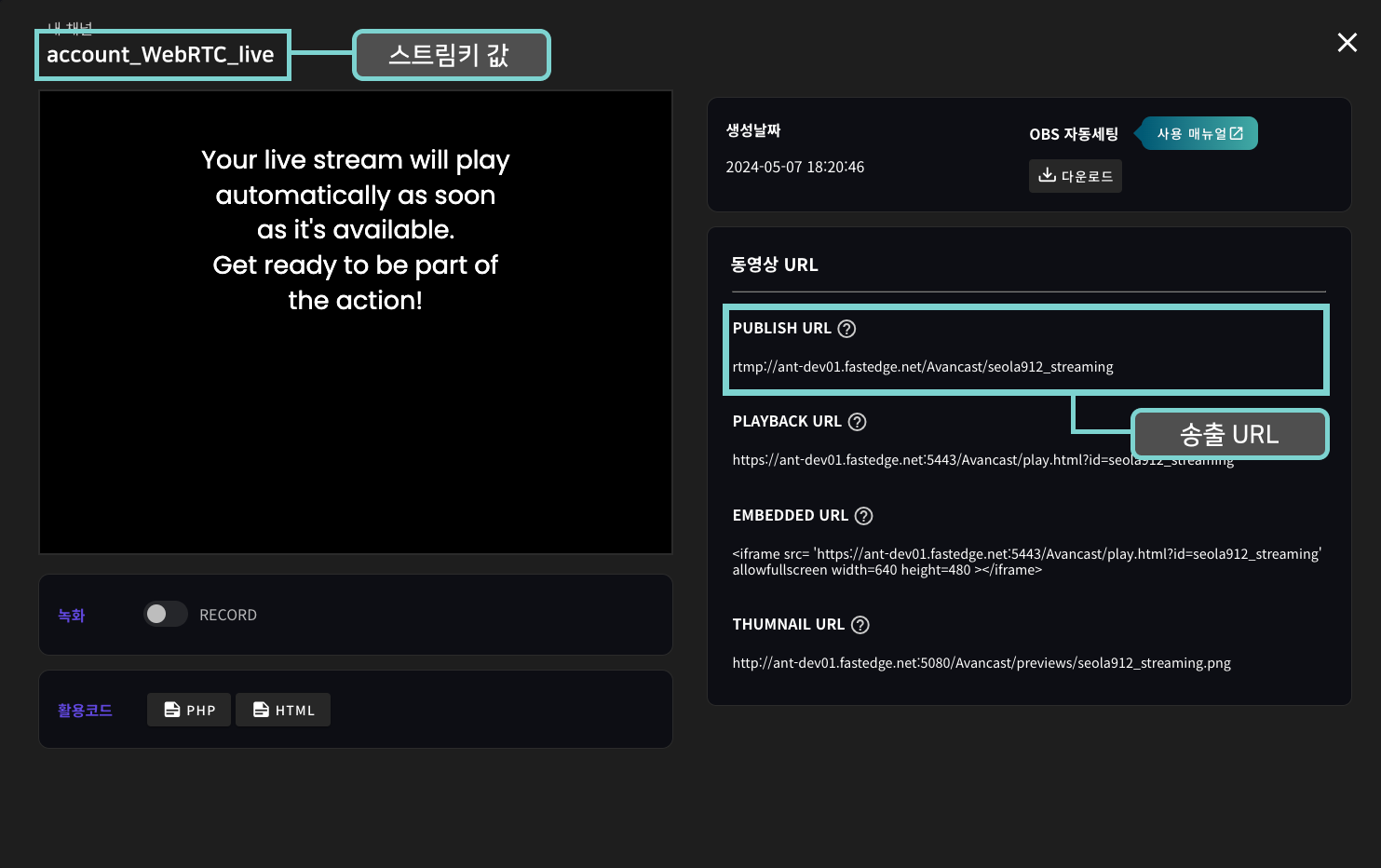 * OBS Studio, VIMX 등 RTMP 기반 송출 프로그램에 URL과 스트림키를 연결하여 사용할 수 있습니다.